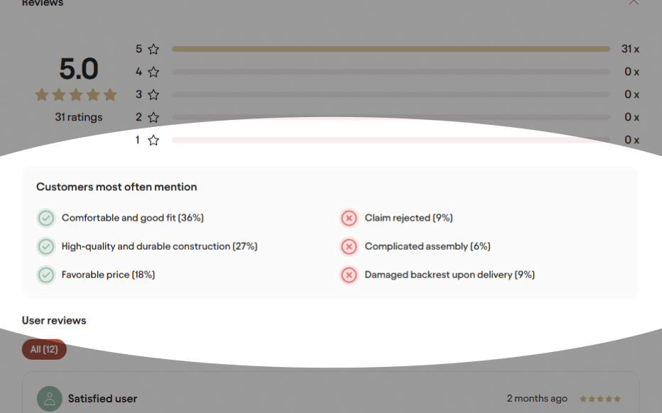 Nechce sa vám preklikávať desiatky recenzií? Máme riešenie. Automaticky spracovávame všetky dostupné recenzie a vytiahneme z nich pre vás to podstatné – čo zákazníci najčastejšie chvália a čo naopak kritizujú. Navyše zahŕňame aj externé recenzie z celého webu, nielen tie z Biana.