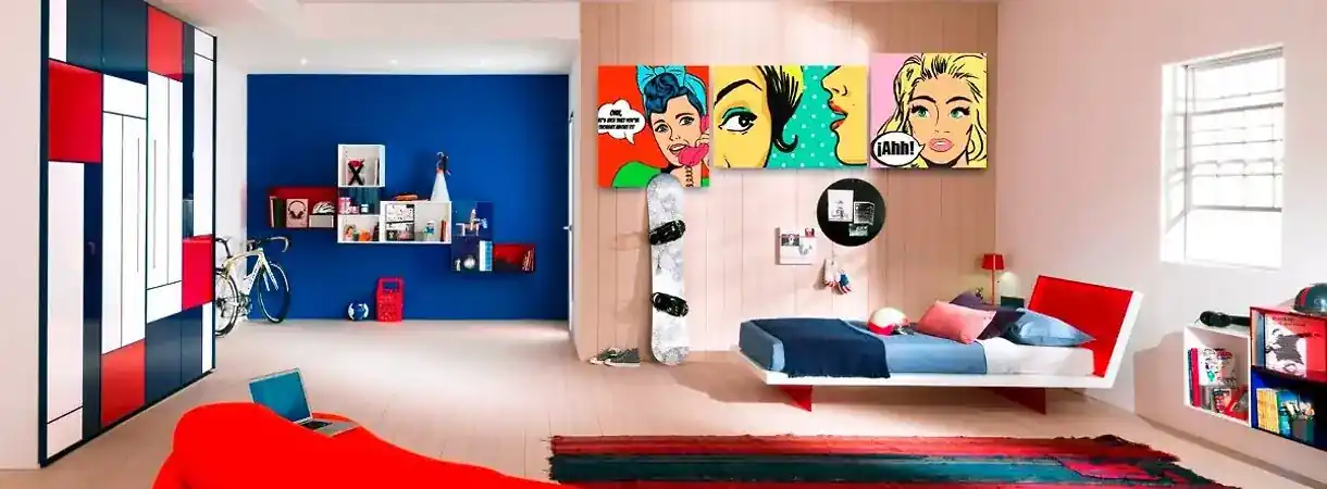 Pop-art si potrpí na výrazné farby a hlavne na ich kombinácie. Typickými farbami sú výrazná žltá, červená, zelená a modrá. Nič nie je tak úplne náhodné - používajú sa hlavne plné odtiene alebo poltóny. A farby môžete aplikovať naozaj všade - na steny, podlahy, ale aj na nábytok. Klasické farby možno doplniť metalickými odtieňmi, vhodná je predovšetkým strieborná. Tento štýl hraničí s určitou gýčovitosťou, takže sa nebojte kombinovať.