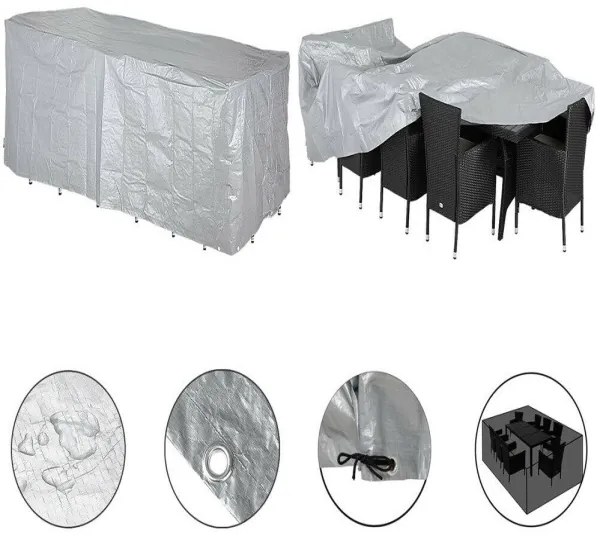 Pri kúpe s nábytkom alebo grilom bude odpočítaná zľava vo výške 10% na plachtu. Až pri fakturácii objednávky. Robustná, odolná proti poveternostným vplyvom ochranná plachta pre 8 + 1 sedení (8 kreslá / 1 stôl) -a ďalšie podobné súpravy sedenie. - S okami pre uchytenie a viazanie - Ochrana proti dažďu, prachu, špine, hrdzu a zeleným riasam - ideálne v lete pre každodenné použitie,alebo na zimu - Odolný proti poveternostným vplyvom polyetylén tkaniny UV 30+