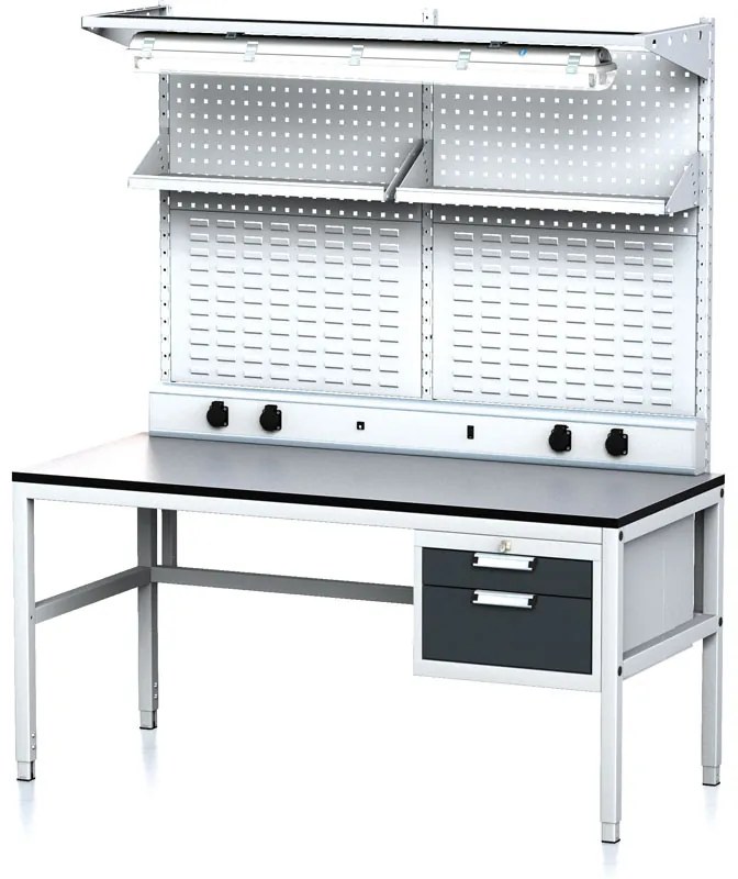 Alfa 3 Nastaviteľný dielenský stôl MECHANIC II, perfopanel, polica, osvetlenie, 2 zásuvkový box na náradie, 1600x700x745-985 mm, sivá/antracit