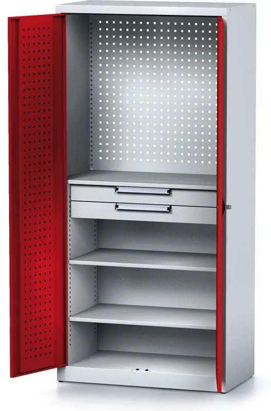 Vybraná varianta:Alfa 3 Policová dielenská skriňa 2-dverová MECHANIC, 2 zásuvky, 3 police, 920 x 500 x 1950 mm, červené dvere