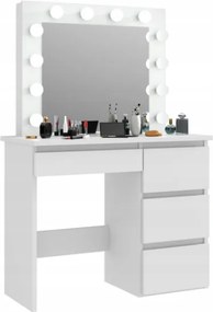 Nádherný toaletný stolík Cleopatra v bielej farbe bude jedinečným a originálnym doplnkom do vašej spálne. Toaletný stolík vďaka modernému a čistému prevedeniu, skvelo zapadne do každej miestnosti vo vašej domácnosti. Stačí mu nájsť vhodné miesto a nechať sa rozmaznávať vo vlastnom kútiku krásy. Líčenie bude odteraz veľká zábava Kozmetický stolík vyniká priestranným úložným priestorom (až 4 veľké zásuvky), kde si môžete usporiadať svoje líčidlá, očné tiene, rúže či šperky pekne pohromade. Zažiarte ako hollywoodska hviezda Toaletný stolík je vybavený veľkým zrkadlom s LED osvetlením. Okolo zrkadla sa nachádza až 12 LED žiaroviek v neutrálnej farbe - najlepšia farba osvetlenia pre vytvorenie dokonalého mejkapu . Zaistí tak ideálne osvetlenie vašej pokožky. Spínač svetiel je umiestnený na bočnej strane zrkadla - je intuitívne použiteľný a diskrétne skrytý. K stolíku vedie kábel dlhý 180 cm. Sada obsahuje okrem žiaroviek aj celú elektroinštaláciu, ktorá je certifikovaná CE. Špecifikácia: moderný dizajn veľké zrkadlo s LED osveltením vyrobený z vysokokvalitnej laminovanej dosky (až 18 mm) bezpečný výrobok (CE vyhlásenie o zhode) priestranný úložný priestor (až 4 veľké zásuvky) pokryté materiálom ABS , ktorý zaisťuje trvanlivosť produktu a odolnosť voči poškodeniu energeticky úsporné LED žiarovky teplota farieb osvetlenia je 4000 K typ žiarovky E14 , 4,5W , 220~240V, životnosť 20 000 h Rozmery stolíka: Celková výška stolíka: 140 cm Výška stolíka bez zrkadla: 75 cm Výška zrkadla: 65 cm Šírka pracovnej dosky/stola: 94 cm Šírka zrkadla: 80 cm Dĺžka stolíka: 43 cm Rozmery zásuviek: 38 x 20 cm Vyrobené z najkvalitnejších materiálov. Podnož z laminovanej dosky s hrúbkou 18 mm, odolná voči oderu a poškriabaniu . Dyhované 0,6 mm hrubou ABS hranou. Vybavená 4 priestrannými zásuvkami, do ktorých sa zmestí množstvo kozmetiky, doplnkov a šperkov.