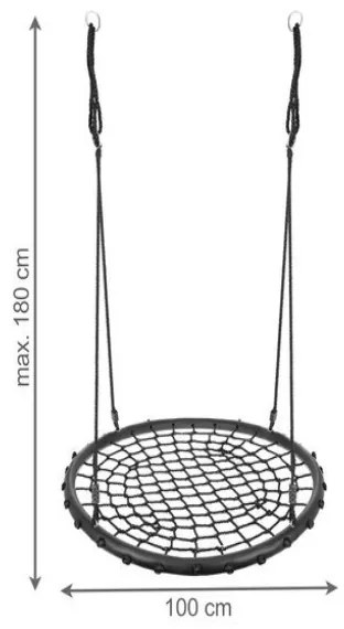 S touto hojdačkou zaručíte svojim deťom určite krásne chvíle zábavy a potešenia. Hojdačku si môžu deti užívať ako v sede, tak v ľahu. Odporúčame umiestniť hojdačku nad rovný povrch anechať okolo nej dvojmetrovú voľnú zónu. Priemer 100 cm Robustná oceľová konštrukcia - široké, okrúhle sedadlo umožňuje bezpečnú hru. NASTAVITEĽNÁ VÝŠKA - montážna sada zaisťuje nastavenie požadovanej výšky. ŠPECIFIKÁCIA - rozmer: 100 / 180cm; priemer sedla: 100 cm; nosnosť 120 kg; hmotnosť 5 kg; hmotnosť s obalom 6.45kg. Upozornenie: Nevhodné pre deti do 36 mesiacov.