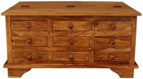 Drevený konferenčný stolík s 9 zásuvkami s rozmermi 90x60x45 cm je ideálnym doplnkom do každej kancelárie alebo obývačky, kde sa spája estetika s funkčnosťou. Tento stôl je vyrobený z vysokokvalitného indického palisandrového dreva a vďaka bohatej štruktúre a teplému odtieňu v sebe nesie čaro exotického dreva. Palisandrové drevo je známe svojou odolnosťou a jedinečným vzhľadom, vďaka čomu je tento kus nábytku nielen praktickým, ale aj estetickým prvkom vo vašom interiéri. Vďaka deviatim precízne vyrobeným zásuvkám ponúka tento stolík dostatok úložného priestoru na všetky vaše kancelárske potreby, dokumenty alebo drobné osobné predmety. Každá zásuvka je navrhnutá pre ľahký prístup a maximálnu organizáciu. Horná plocha je ideálna na vystavenie dekorácií alebo drobných spotrebičov, ktoré dodajú vášmu priestoru osobitý nádych. Tento drevený konferenčný stolík je všestranným nástrojom a vynikajúcou voľbou pre tých, ktorí ocenia nielen jeho funkčné vlastnosti, ale aj jedinečnú estetiku dreveného nábytku s indiánskym duchom. Zvoľte si ho ako ústredný prvok svojho interiéru, ku ktorému sa výborne hodia ďalšie kusy dreveného nábytku, ako sú knižnice, komody, písacie stoly alebo jedálenské stoly, ktoré dokonale doplnia vašu domácu pracovňu alebo obývaciu izbu. Ak hľadáte masívny nábytok, ktorý spojuje funkčnosť s estetickým dizajnom, tento konferenčný stolík je tou pravou voľbou. Prežite krásu rustikálneho nábytku, ktorý dodá vášmu domovu tradičný šarm.