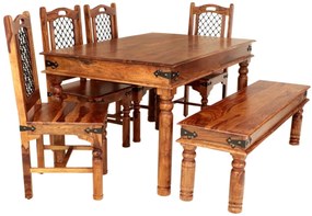 Predstavujeme vám exkluzívny jedálenský set s lavicou pre 6 osôb z masívu palisander, ktorý pochádza z nádhernej Indie. Tento jedálenský set, súčasť Kolekcie JALI, je dokonalou voľbou pre každého, kto si praje vniesť do svojho domova eleganciu a trvanlivosť masívneho nábytku. S rozmermi stola 140 cm na šírku, 76 cm na výšku a 90 cm na hĺbku je tento set ideálny pre priestranné jedálne, kde bude centrálnym bodom každého rodinného stretnutia či oslavy s priateľmi. Každý kus tohto jedálenského setu je vyrobený z vysokokvalitného a odolného dreva palisandru, čo zaručuje, že bude nielen pôsobivý na pohľad, ale aj dlho vydrží. Set obsahuje stôl, štyri pohodlné stoličky a lavicu, ktorá prináša netradičné prvky a zvyšuje celkovú kapacitu na sedenie. Tento jedálenský set s lavicou je ideálnym riešením pre každú modernú jedáleň. Okrem jeho funkčnosti a estetického vzhľadu je palisandrové drevo cenené pre svoju jedinečnú kresbu a teplé tóny, ktoré prinášajú do interiéru nádych exotiky a luxusu. Vďaka svojmu pôvodu z Indie nesie tento jedálenský set v sebe kúsok vzdialených krajov a orientálny štýl. Pre dotvorenie kompletného vzhľadu vašej jedálne odporúčame tieto druhy nábytku: vitrína, príborník, konferenčný stolík a TV stolík. Tieto kúsky doplnia váš jedálenský set a vytvoria harmonický celok v každom priestore. Rozmery jedálneho setu (š / v / h): • stôl: 140/76/90 cm • stoličky: 45/100/45 cm • lavice: 140/45/40 cm