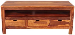 Elegantný drevený TV stolík z masívu palisandra je skvelým doplnkom pre váš obývací pokoj. Tento stolík, vyrobený z kvalitného palisandra, ponúka nielen štýl a kvalitu, ale aj praktickosť vďaka svojej pevnej konštrukcii. S rozmermi 120 cm na šírku, 40 cm na hĺbku a 50 cm na výšku poskytuje dostatok priestoru pre všetky vaše potreby. Stolík je vybavený tromi priestrannými šuplíkmi, ideálnymi na uschovanie diaľkových ovládačov, DVD diskov či iných nevyhnutností. Okrem toho disponuje jednou praktickou poličkou o výške 17 cm, ktorá je ideálna na umiestnenie hernej konzoly alebo set-top boxu. Tento drevený TV stolík z palisandra pochádza z Indie, čo do vášho interiéru prináša dotyk exotiky a unikátneho dizajnu. Tento typický drevený nábytok z masivu sa stane nepostrádateľnou súčasťou vášho domova. Ľudia často zaobstarávajú k dreveným TV stolíkom aj drevené konferenčné stolíky, knižnice, komody a vitríny, ktoré dopĺňajú celkový štýl a funkčnosť interiéru.