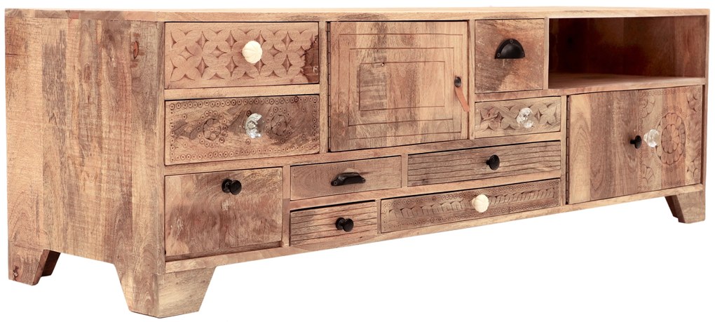 Predstavujeme vám nádherný televízny stolík z masívneho dreva mango s rozmermi 160x50x45 cm, ktorý prinesie do vášho domova kúzlo a eleganciu indického nábytku. Tento televízny stolík je vyrobený z prvotriedneho mangového dreva, známeho svojou odolnosťou a jedinečnou štruktúrou. Na pohľad vás očarí množstvo malých šuplíkov, ktorých dvierka zdobia ručne vyrezávané ornamenty. Každý šuplík je vybavený rôznymi úchytkami pre jednoduché otváranie a zatváranie, čo celý dizajn posúva na vyššiu úroveň estetického zážitku. Tento ručne vyrobený stolík z masívu je skvelým prírastkom do vašej obývacej izby, ktorý garantuje ako funkčnosť, tak aj krásny umelecký prvok. Indický nábytok je známy svojou kvalitou a jedinečnosťou, a tento televízny stolík je toho jasným dôkazom. Nielen, že poskytuje dostatok úložného priestoru pre všetky vaše multimediálne potreby, ale zároveň sa stane centrálnym bodom, ktorý upúta pozornosť vašich hostí. Druhy nábytku, ktorý sa má zakúpiť: Konferenčný stolík z masívneho dreva Knižnica z masívneho dreva Pohovka s indickými prvkami Jedálenský stôl z masívneho dreva
