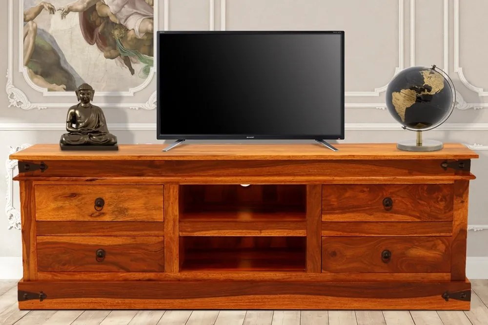 Rustikálny TV stolík z masívneho dreva palisander 160x55x45 je skvelým doplnkom do každého interiéru, ktorý ocení kvalitný dizajn i praktickosť. Tento nádherný kus rustikálneho nábytku, spadajúci do kolekcie JALI, kombinuje prírodnú krásu a funkčnosť dreva palisander, ktoré pochádza z Indie. Jedinečný dizajn tohto rustikálneho TV stolíka je zvýraznený kvalitným remeselným spracovaním s dôrazom na detaily. Drevo palisander je známe svojou odolnosťou a estetickou hodnotou, čo zaručuje, že tento rustikálny TV stolík vydrží dlhé roky a bude stále vyzerať skvele. Stolík ponúka praktické riešenie pre umiestnenie vašej elektroniky vďaka svojim bočným zásuvkám s elegantnými kovovými úchytkami a otvorenému priestoru ideálnemu pre umiestnenie audio a video techniky. Je nielen krásnym, ale aj funkčným prvkom, ktorý sa hodí do obývačky, kde prirodzene kombinuje rustikálny šarm s modernými technológiami. K tomuto typu rustikálneho nábytku ľudia často kupujú aj ďalšie kusy z tej istej kolekcie, ako sú rustikálne konferenčné stolíky, rustikálne knižnice, rustikálne komody a rustikálne police. Tieto doplnky spolu vytvárajú harmonický a zjednotený priestor, ktorý vyžaruje teplo a pohodu domova.