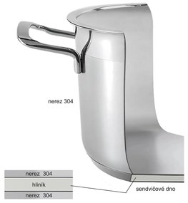 Nehrdzavejúce hrnce predstavujú vďaka používaným technológiám a kvalitným materiálom výrobok vhodný pre každú modernú domácnosť a sú ideálnou cestou ku zdravej výžive, diétnej, ekonomickej a estetickej príprave pokrmov.Sú vyrobené z vysoko kvalitnej nehrdzavejúcej ocele 18/10. Vonkajší a vnútorný povrch nádob je vysoko leštený, takže bráni usadzovaniu nečistôt a zaručuje dokonalú údržbu. Sendvičové dno s termoakumulačnými vlastnosťami zaručuje rýchle a ekonomické varenie s výraznou úsporou energie.