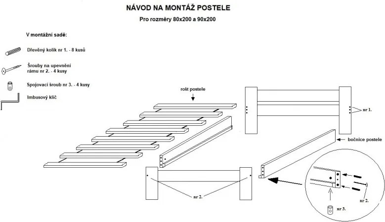 Materiál: masívna borovica + drevený latkový rošt Šírka: 87,5 - 97,5 - 127,5 - 14,75 - 167,5 - 187,5 cm Dĺžka: 200 cm Výška: 25 cm Výška čela: 50 cm Výška od zeme k matracu: 25 cm Vnútorná šírka lôžka: 80,5 - 90,5 - 120,5 - 140,0 - 160,5 - 180,5 cm Vnútorná dĺžka lôžka: 200,5 cm Hĺbka rámu: 7 cm