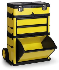 · robustný pojazdný box s hliníkovým vysúvacím madlom a pogumovanou rukoväťou · materiál: kombinácia odolného plastu a kovu s povrchovou úpravou práškovým lakovaním žltej farby · ľahkú manipuláciu zaisťujú dve veľké 150 mm plastové kolieska s gumovým behúňom HORNÁ ČASŤ · oddiel je možné použiť ako samostatný kufor · úložný priestor s pántami z nehrdzavejúcej ocele pre bezpečné uzatvorenie PROSTREDNÁ ČASŤ · oddiel je možné použiť ako samostatný kufor · dve výsuvné zásuvky bez ďalšieho vnútorného delenia · spoľahlivý výsuv zabezpečujú guľôčkové pojazdy · bočné plastové pánty pre bezpečné zaistenie SPODNÁ ČASŤ · oddiel je možné použiť ako samostatný kufor · veľký výklopný úložný priestor · bočné plastové pánty pre bezpečné zaistenie Vnútorné rozmery (š x h x v): · Horná časť - 495 x 240 x 95 mm · Prostredná časť (zásuvka) - 410 x 205 x 97 mm · Spodná časť - 412 x 225 x 305 mm