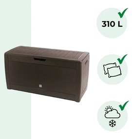 Ideálna možnosť úschovy pre vašu záhradu! Tento odkladací box s ratanovým vzhľadom je ideálnym miestom na úschovu podsedákov, vankúšov a iného záhradného príslušenstva. Odkladací box odolný voči poveternostným vplyvom a UV žiareniu s objemom 310 litrov ponúka dostatok miesta. Pre ľahšiu manipuláciu je vybavený kolieskami a troma rukoväťami. Jeho montáž je jednoduchá. Objem boxu až 310 l na uskladnenie záhradného príslušenstva či textilu. Box je odolný voči vplyvom počasia a UV žiareniu. Praktické sklápateľné veko, ktoré ochráni obsah boxu. Elegantné zapustené rukoväte pre bezpečnú manipuláciu. Technické údaje: materiál: polypropylén vonkajšie rozmery (d x š x v): 119cm x 48cm x 60cm vnútorné rozmery (d x š x v): 114,5cm x 45cm x 55cm hmotnosť: 6,6 kg farba: hnedá Výhody produktu: ratanový vzhľad ľahké otváranie poklopu s kolieskami a rukoväťami pre jednoduché presúvanie odolný voči poveternostným vplyvom a UV žiareniu jednoduchá montáž 310 litrový objem dostatok miesta pre podsedáky, vankúše a iné záhradné príslušenstvo