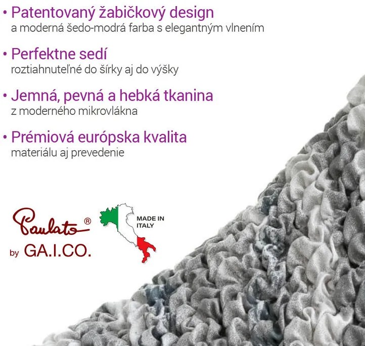 Talianska elegancia v prémiovej kvalite Vôňa slanej vody vo vzduchu, šumenie morskej peny na zlatistom piesku, vlny tiahnuce sa na nekonečný obzor… Presne taký je oceán, ktorým sa nechala inšpirovať aj rovnomenná kolekcia Oceano. Jej motívy pripomínajú nielen morskú hladinu, ale aj stopy vĺn odtlačené do piesočných pláží. Výrazný, ale napriek tomu jemný dizajn do vášho domova prinesie pokoj a harmóniu, ktorú vie navodiť iba more. A čo viac – spenenú vodu, ktorá sa na brehu mieša s pieskom a uteká späť do mora, vám pripomenie aj pekná štruktúra jemného (a napriek tomu veľmi odolného) mikrovlákna na gumičkovej osnove. Popredný svetový výrobca GAICO vyrába exkluzívne poťahy už vyše dvadsať rokov a za tú dobu má množstvo spokojných zákazníkov, ktorí sa k jeho elastickým poťahom opakovane vracajú. Unikátna plastická štruktúra Poťahy Oceano sú vyrobené zo špeciálneho mikrovlákna s pružnou gumičkovou osnovou a sú unikátne svojou patentovanou „žabičkovou“ štruktúrou. Tá dodáva poťahom originálny vzhľad a takmer zamatovú hebkosť príjemnú na dotyk. Tkanina je vyrobená z veľmi jemných a pevných a odolných vlákien, ktorých veľkosť je 100-krát menšia ako ľudský vlas. Prémiová kvalita prevedenia a prvotriedny elastický materiál zaručujú dlhú životnosť. Vyladená paleta šedých a modrých odtieňov pôsobí moderným šik dojmom, ktorý dodá vašej izbe novú atmosféru bez náročnej výmeny celej sedačky. Perfektne sedia a spoľahlivo ochránia Patentovaná technológia bi-elastických poťahov zaisťuje ich roztiahnuteľnosť do šírky aj do výšky. Poťahy perfektne obopnú kreslo či pohovku ako pravé čalúnenie a zvýraznia ich tvary a línie. Vzhľad sedačky s nimi môžete ľahko meniť kedykoľvek podľa nálady alebo napríklad ročného obdobia. Poťahy OCEANO prinesú vášmu sedaciemu nábytku nielen nový vzhľad, ale ho aj ochránia pred škvrnami, prachom či opotrebovaním. Ušetria čas a náklady na výmenu sedačky a predĺžia jej životnosť. Poťahy ľahko vyperiete v práčke a usušíte v sušičke alebo klasicky vyvesením. Ani opakovaným praním poťahy nestrácajú svoju elasticitu. Upozornenie: Poťahy nie sú vodeodolné. Ako zmerať kreslo Naše napínacie poťahy sú navrhnuté tak, aby sa perfektne prispôsobili väčšine tvarov a typov kresiel, sedačiek aj ostatných typov čalúneného nábytku. Porovnajte rozmery vášho kresla či pohovky s nákresom. V prípade pochybností medzi dvoma rozmermi poťahov odporúčame vziať ten väčší. Prebytočnú látku ľahko zasuniete medzi sedák a operadlo. K zafixovaniu poťahu odporúčame použiť Upevňovací valčeky. Pokiaľ si nebudete istí, či je poťah pre vaše kreslo či sedačku vhodný, rady vám poradia naše telefónne operátorky, on-line chat alebo píšte na info@dedoma.sk.