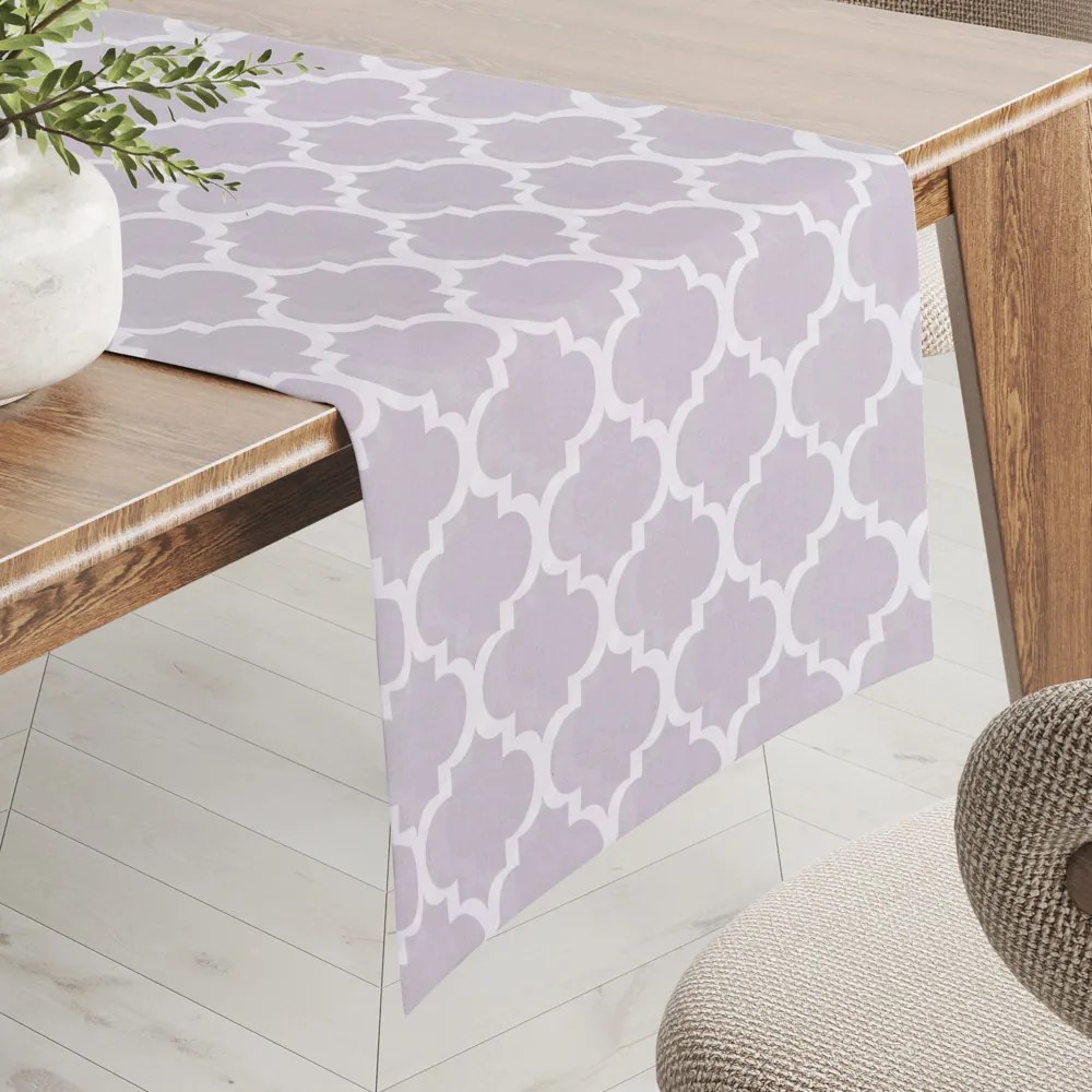 Dekoračný behúň na jedálenský stôl so vzorom bielych marockých ornamentov na sivom podklade. Je ušitý z husto tkaného 100% bavlneného plátna s certifikátom zdravotnej nezávadnosti Oeko-Tex 100. Behúň dodávame kompletne obšitý. Dekoračné behúne Sandra sú praktickým doplnkom interiéru Vášho domu, bytu, chalupy a sú vhodné aj do hotelov a reštaurácií. Odporúčaný presah (previs) behúňa je cca 20-30 cm na každej strane stola, tzn. ak máte stôl dlhý napr. 100 cm, objednajte behúň s dĺžkou 140 až 160 cm. Šijeme v našich krajčírskych dielňach v ČR, ponúkame aj rozmery na mieru.