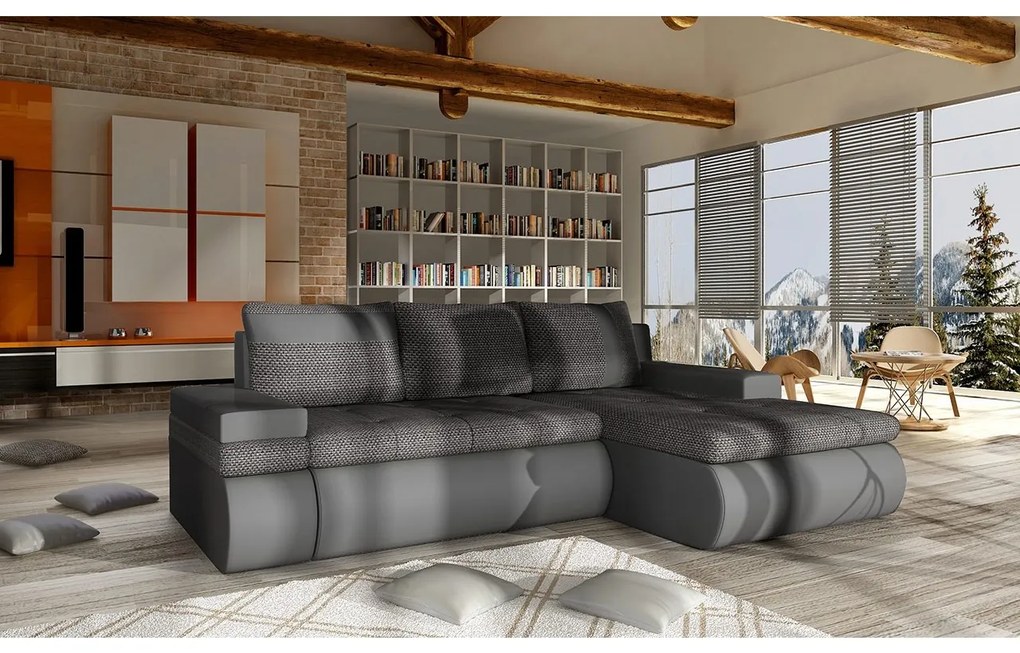 Rozkladacia rohová čalúnená sedacia súprava s úložným priestorom do tvaru L AVESTA pravá sivá