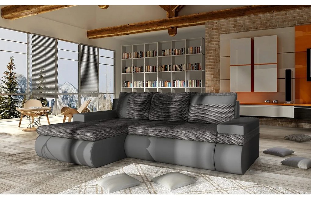 Rozkladacia rohová čalúnená sedacia súprava s úložným priestorom do tvaru L AVESTA pravá sivá