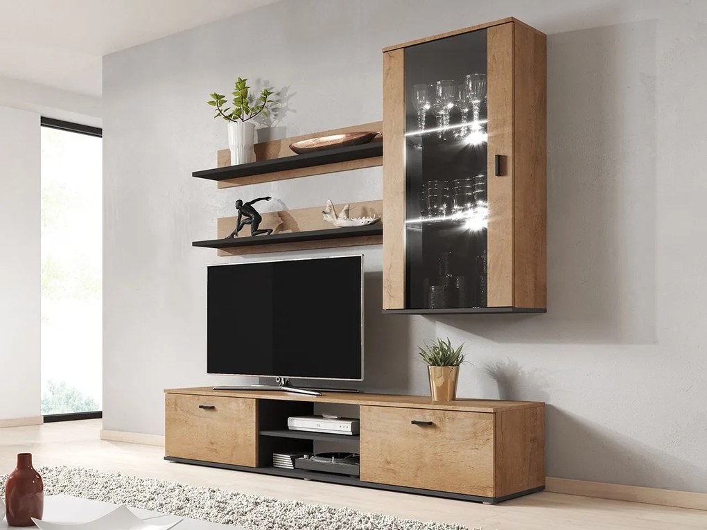 Vybraná varianta:Obývacia stena Boho V, Osvetlenie: osvetlenie LED biele, Farby: čierny / čierny lesk