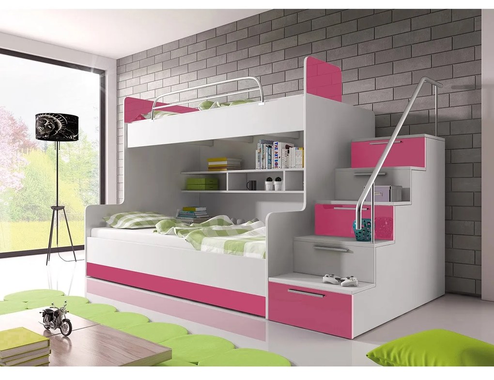 Poschodová posteľ Paradise II, Farby: biela / biely lesk + ružový lesk, Strana: ľavá