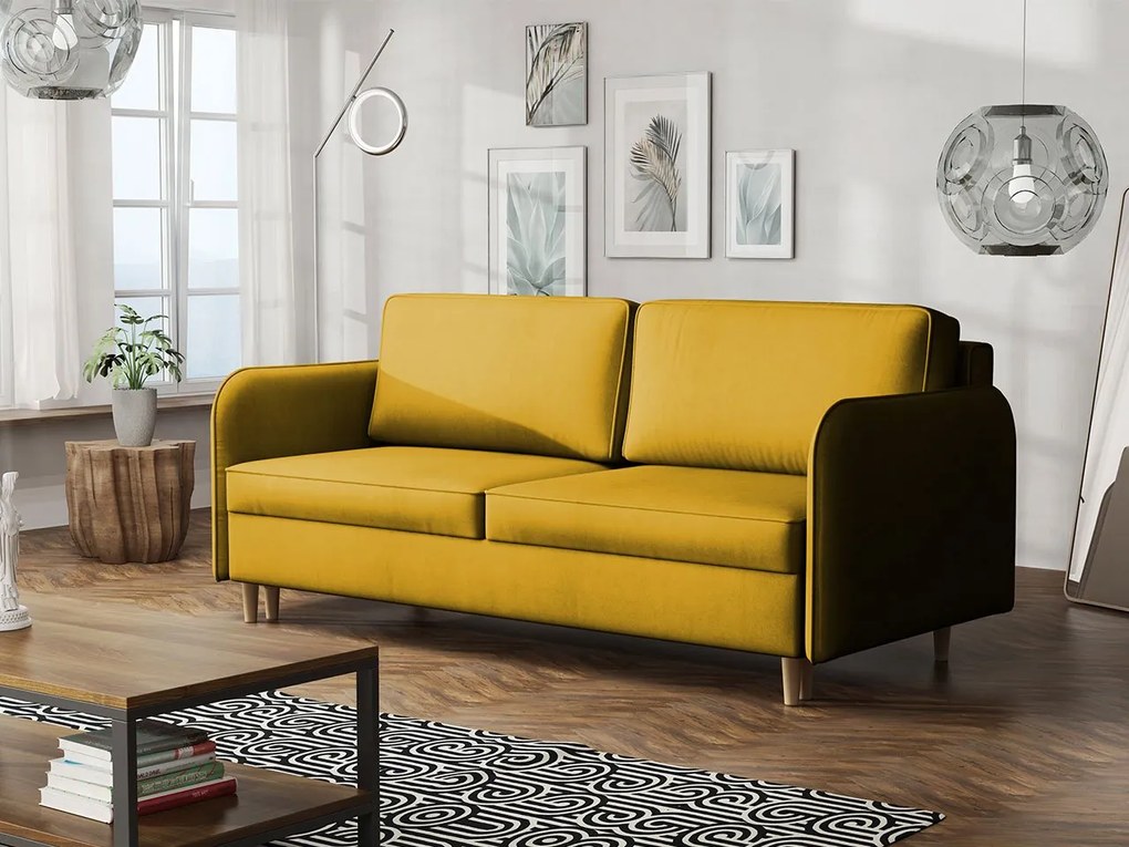 Štýlová pohovka do obývacej izby Aisha je štýlový kus nábytku, ktorý vám poskytne pohodlie pri každodennom odpočinku. Pohovka je tiež vybavená funkciou spania a po rozložení získate priestor na spanie, ktorý poskytuje pohodlné podmienky pre dve osoby. Vo vnútri nábytku je tiež praktický úložný priestor na posteľnú bielizeň.Pohovka vyzerá elegantne vďaka vysokokvalitnému čalúneniu. Plyšová látka použitá v procese výroby nábytku zaručuje dokonalý vzhľad a trvanlivosť. Z dostupnej farebnej palety si môžete vybrať farbu, ktorá dokonale ladí so zvyškom vašej obývačky.Rozmery:šírka: 209 cm,hloubka: 100 cm,výška: 95 cm,plocha na spanie: 193 x 146 cmMateriál:rám: borovicové drevo + drevotrieska,sedadlo: T28 / 30 pena + vlnová pružina,operadlo: T28 / 30 pena + vlnová pružina,rozkladacia pohovka,má funkciu spania,úložný priestor na posteľnú bielizeň,nohy: drevené,operadlo vo forme pohyblivých vankúšov,vankúše v súprave so zipsom,voľne stojaca pohovka (čalúnená látkou)Rozmery úložného priestoru:- dĺžka: 188 cm,- šírka: 59,5 cm,- výška: 15 cmZáruka: 24 mesiacov