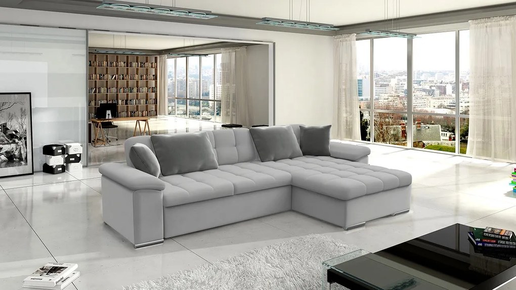 Rozkladacia rohová čalúnená sedacia súprava s úložným priestorom do tvaru L AVESTA pravá sivá