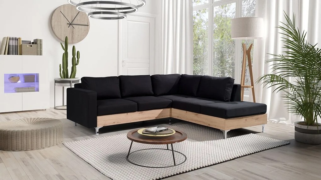Rohová pohovka Hermes Wood, Farby: ekokoža Soft 011 (čierna), Farby nožičiek: dub artisan, Strana: pravá