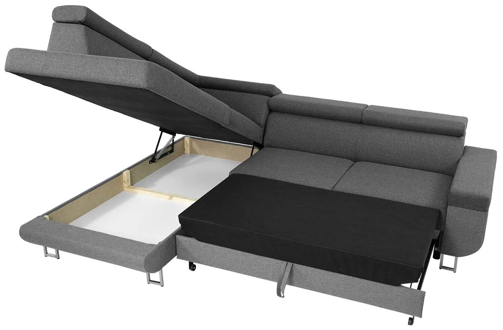 Rozkladacia rohová čalúnená sedacia súprava s úložným priestorom do tvaru L AVESTA pravá sivá