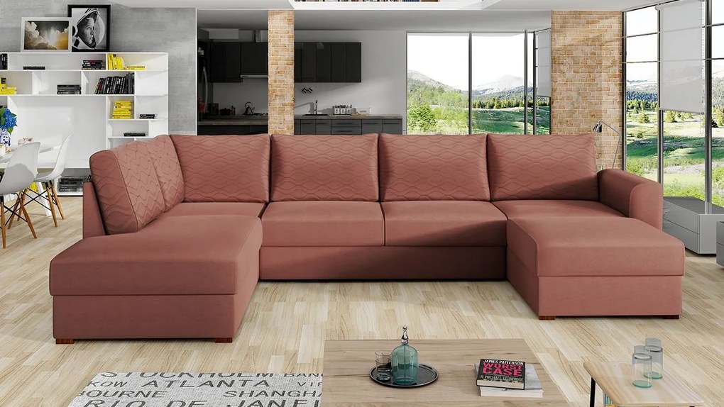Rohová rozkladacia pohovka Astana Premium má tvar písmena "U". Použitie takéhoto tvaru poskytuje veľa miest na sedenie pre členov domácnosti a hostí. Charakteristickým znakom tohto modelu sú dekoratívne vankúše, ktoré tvoria pohyblivé operadlo. Sada obsahuje 6 vankúšov. Za pozornosť stoja aj kvalitné komponenty, ktoré zaisťujú pohodlie pri používaní. Sedadlo je vybavené vlnovou pružinou a hustou penou T2844. Pri sedení aj spánku na pohovke sa budete cítiť pohodlne. V rozloženom stave pohovka dosahuje plochu 140 cm, čo zaisťuje pohodlný spánok pre dvoch ľudí. Okrem toho má dva úložné priestory na posteľnú bielizeň, ktoré sú umiestnené pod pohovkou. V popise pohovky nemôžeme ignorovať ani materiály. Vybrané materiály spĺňajú najvyššie požiadavky na kvalitu a zodpovedajú súčasným trendom interiérového dizajnu.Rozmery:šírka: 305 cm,hĺbka: 188 cm,výška: 85 cm,plocha na spanie: 272 x 140Rozmery úložného priestoru (dva kusy):dĺžka: 180 cm,šírka: 80 cm,výška: 21 cm,adĺžka: 150 cm,šírka: 69 cm,výška: 21 cmPrevedenie:konštrukcia sedadla: drevený rám + pružina + plsť + pena T2844 s hrúbkou 11 cm,konštrukcia operadla: drevený rám + HDF doska + T2844 pena hrúbka 1 cm,pohovka je rozložiteľná, čo sa dá využiť na spanie,typ rohu "U",úložný priestor na posteľnú bielizeň,vankúše v cene (6 veľkých) - na zips,operadlo vo forme mäkkých vankúšov,drevené nohy (tmavý orech)Záruka: 24 mesiacov