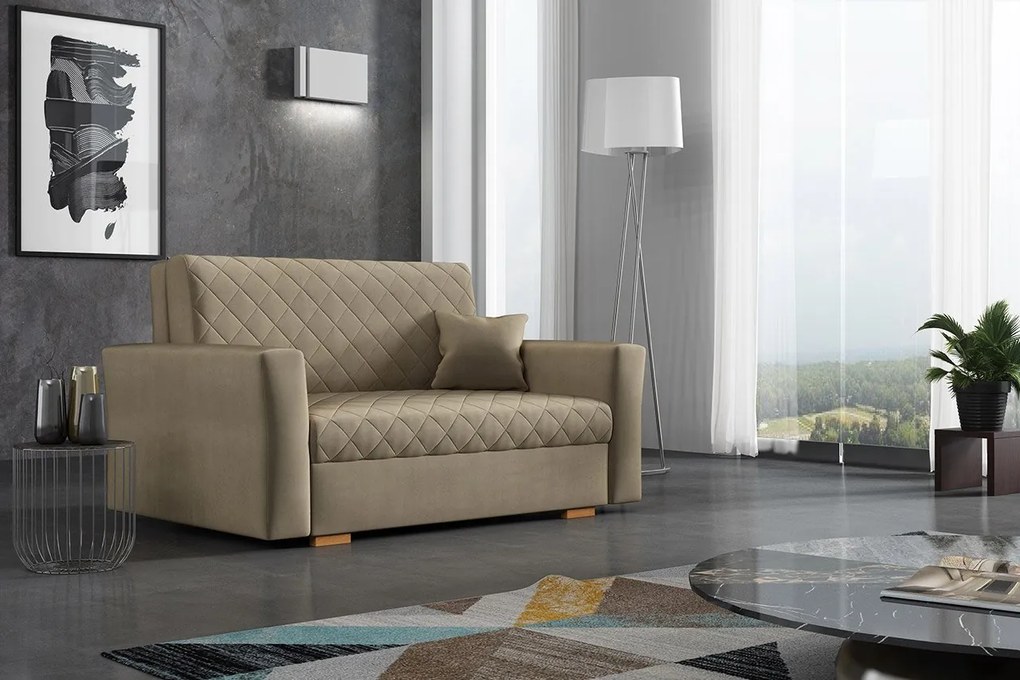 Dvojitá pohovka Clivia Caro II je predovšetkým príjemným miestom na posedenie počas popoludnia. Pohovka má elegantný vzhľad vďaka jednotným farbám a klasicky prešívanému povrchu sedadla a operadla. Takýto vzhľad z neho robí dokonalý doplnok do interiéru reprezentatívnej obývacej izby, ako aj do interiéru mládežníckej izby.Vďaka automatickému sklápaciemu mechanizmu, ktorý uľahčuje rozloženie, sa z pohovky s funkciou spánku stáva pohodlná posteľ s priestorom na spanie optimálnym pre dve osoby. Vo vnútri nábytku je tiež praktická posteľná bielizeň.Rozmery:šírka: 145 cm,hĺbka: 98 cm,výška: 85 cm,plocha na spanie: 196 x 115 cmPrevedenie:rám: borovicové drevo + drevotrieska,sedadlo: pena T25 / 42 + vlnová pružina,operadlo: T25 / 42 pena + doska HDF,otvorená pohovka,má funkciu spánkuúložný priestor na posteľnú bielizeň,automat na ľahké rozloženie,nohy: drevené,čalúnené operadlo pevne pripevnené,vankúš bez zipsu v cene,voľne stojaca pohovka (čalúnená látkou)Rozmery úložného priestoru:- dĺžka: 109 cm,- šírka: 66 cm,- výška: 19 cmZáruka: 24 mesiacov