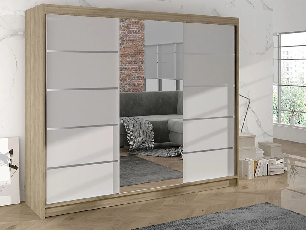 Najpriestrannejšia posuvná skriňa Geneva VI dokonalo zapadne do priestoru domácej skrine. Použitím políc, ktoré vypĺňajú jeho vnútro a tyče na vešiaky, zabezpečíte optimálne miesto pre vaše oblečenie, topánky a tašky.Módny vzhľad šatníka zdôrazní štýl interiéru miestnosti, v ktorej bude umiestnený. Obývacia izba, spálňa, výklenok v hale. Každá z týchto izieb bude ťažiť z priestranného interiéru šatníka.Ďalšou výhodou nábytku je zrkadlo na jednom z čiel. Okrem toho, že vám umožní vidieť samých seba pred odchodom, má ešte jednu funkciu – odráža slnečné lúče, osvetľuje miestnosť.Rozmery: šírka: 200 cm,výška: 215 cm,hĺbka: 58 cmPrevedenie:16 mm hrubá laminovaná doska,okraje zakončené PVC dyhou,systém posuvných dverí,hliníkové vodidlá,zrkadlo na prednej strane,hliníkové kľučky pozdĺž dverí - zabraňujú ohnutiu dverí,šatníková skriňa vybavená priestrannými policamiZáruka: 24 mesiacov