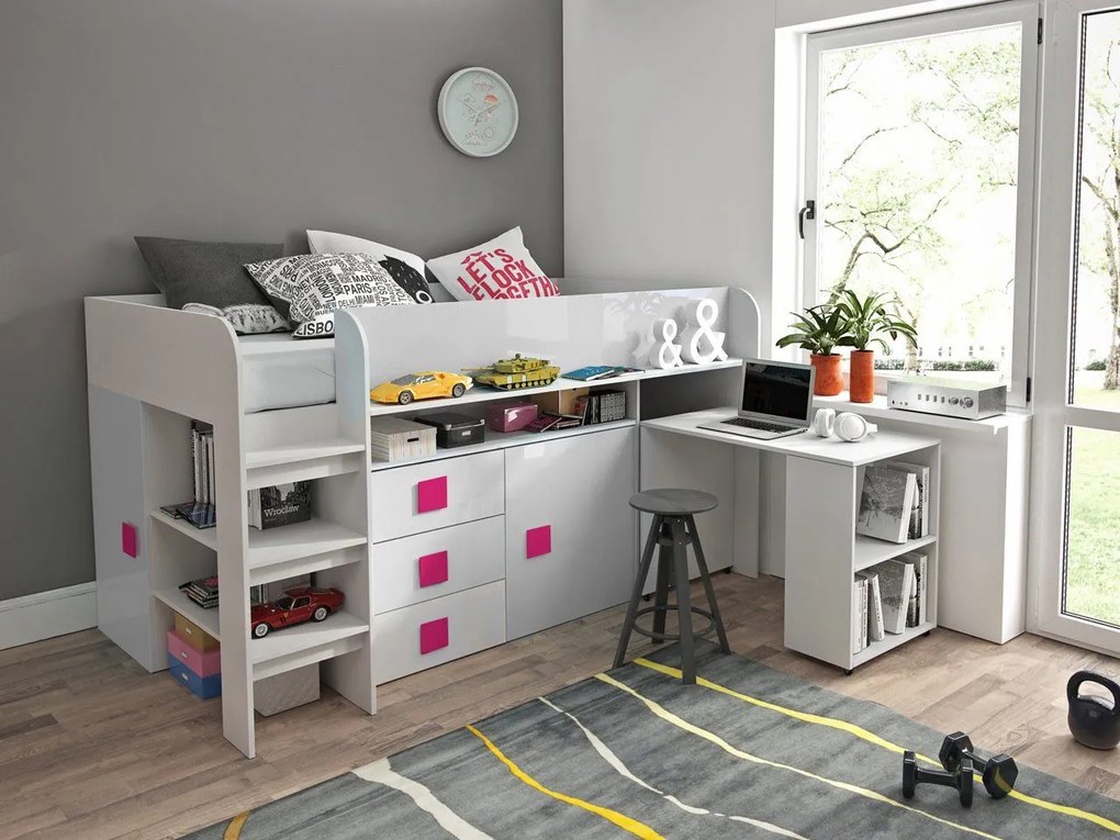 Poschodová posteľ s písacím stolom Tomson 1, Rozmer matraca: bez matraca, Farby: Biela + Biely lesk + Ružová