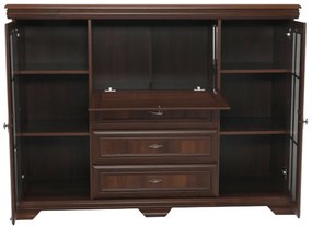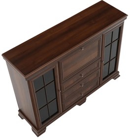 Barová skrinka Kraz KK6 je elegantná a masívna komoda s presklenými dvierkami, tromi zásuvkami a výklopnou časťou v rustikálnom štýle. Komoda v peknom tmavom prevedení Samoa king sa vyníma v obývačkách, jedálňach a pracovniach. Materiálom použitým na výrobu sú laminovaná DTD, MDF, sklo a kov. Hrúbka materiálu korpusu je 15 mm, vrchnej a dolnej dosky 22 mm. Skrinka má výšku 117 cm, šírku 158 cm a hĺbku 46 cm. Barová skrinka Kraz KK6 spolu so sektorovým nábytkom Kraz sú skvelou voľbou pre tých, ktorí si chcú zariadiť svoju domácnosť v rustikálnom štýle.