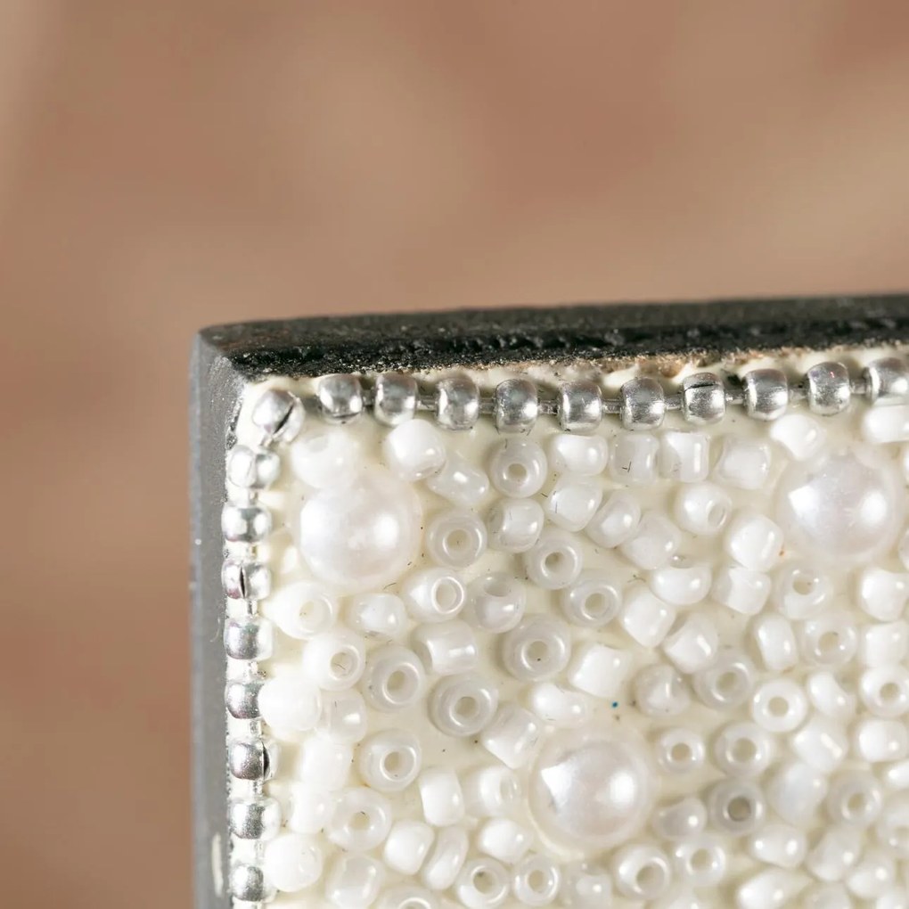 Dekoračný rám zdobený korálikmi a perlami.Dokonalé miesto na spomienky zachované vo fotografii. Perfektný nápad na elegantný darček.Rozmery: šírka 15,5 cm, hĺbka 1,5 cm, výška 20,5 cm., miesto na fotku 10x15cm.Materiál: korálkyFarba: perla