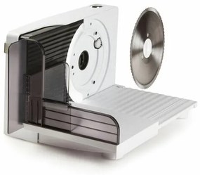 Elektrický krájač potravín sa vďaka svojim kompaktným rozmerom a skladacej doske ľahko zmestí do každej kuchyne a na každú pracovnú dosku. Na krájači je možné jednoducho na rovnomerné plátky nakrájať aj čerstvý chlieb, tvrdšie údeniny, syry alebo zeleninu (napr. uhorku). Bezpečnú prácu s krájačom zaisťujú prísavné nožičky, veľký chránič palca a prítlačná doska umožňujúca krájanie až do posledného plátku chleba.Nastavenie hrúbky rezu uľahčuje veľké otočné koliesko s jemnou aretáciou s možnosťou nastaviť hrúbku plátku od 1 mm až do 17 mm. Pojazdovú dosku s chráničom palca i prítlačnou doskou je možné jednoducho odňať a nechať umyť v umývačke riadu. Aj samotný nôž je možné z krájača vybrať bez použitia ďalších nástrojov a umyť ho pod tečúcou vodou.Parametre: doska pojazdu: 15,1 x 19,8 cm veľmi ostrý nôž z nehrdzavejúcej ocele s vrúbkovaným profilom ľahko vyberateľný nôž priehradka na zmotanie kábla bezpečnostná poistka spúšťacieho tlačidla chránič palca pre bezpečné posúvanie potravín