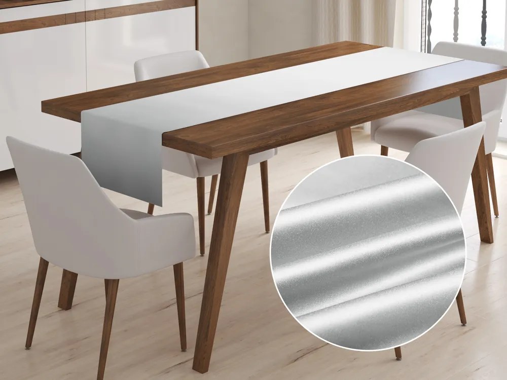 Dekoračný saténový behúň na jedálenský stôl v striebornej farbe, ušitý zo 100% polyesterovej látky Satén LUX. Vysoká pevnosť a luxusný lesklý vzhľad, to sú hlavné prednosti tejto látky. Lícová strana látky je kovovo lesklá, rubová strana je matná. Gramáž látky 250 g/m2. Dekoračné behúne sú praktickým doplnkom interiéru Vášho domu, bytu, chalupy a sú vhodné aj do hotelov a reštaurácií. Odporúčaný presah (previs) behúňa je cca 20-30 cm na každej strane stola, tzn. ak máte stôl dlhý napr. 100 cm, objednajte behúň s dĺžkou 140 až 160 cm. Šijeme v našich krajčírskych dielňach v ČR, ponúkame aj rozmery na mieru.