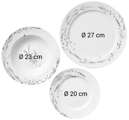 Elegantné jedálenské taniere s atraktívnym prírodným dekorom na každú príležitosť. Taniere PROVENCE sú vyrobené z kvalitného prírodného porcelánu. Upútajú pozornosť svojim sviežim dekorom s motívom levandule.Obsah sady: 4x plytký tanier - pr. 27 cm 4x hlboký tanier - pr. 23 cm 4x dezertný tanier - pr. 20 cm