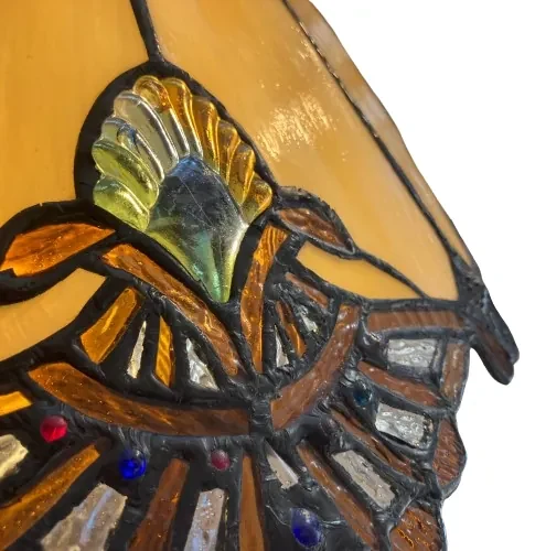 Závesná lampa Tiffany z kolekcie GOLD. Krémovo – medový základ vitráže je zdobený vkusným pestrofarebným vzorom. Vkusná, moderná vitráž.