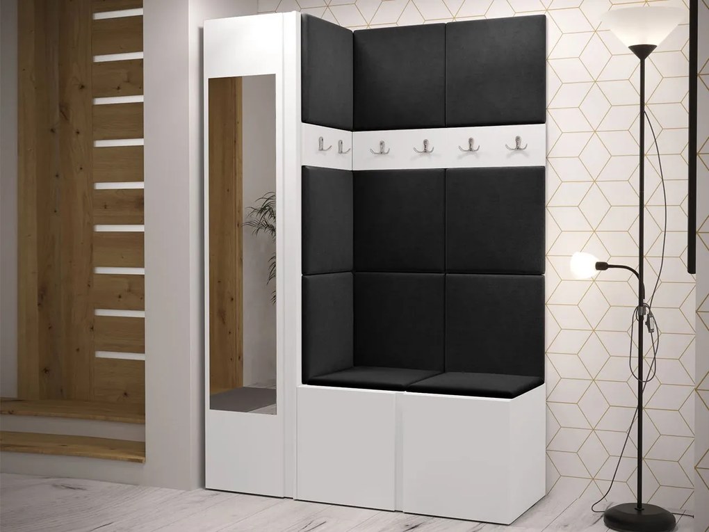 Predsieňová zostava Tavasz X skvele doplní priestor v každom byte. Jeho nepochybnou výhodou je zrkadlo. Toto riešenie ho robí ešte praktickejším, pretože okrem úložného priestoru máme možnosť sa pred odchodom z domu aj rozhliadnuť.Môžete si do nej schovať topánky a ich obúvanie bude mimoriadne jednoduché vďaka tomu, že ide o kus nábytku do predsiene so sedačkou. Farby čiel a čalúnených panelov sú široké a prispôsobené väčšine projektov. Absencia úchytiek dodáva moderný charakter.Je to kus nábytku, ktorý nás víta hneď po vstupe do domu. Stojí za to zabezpečiť, aby šatník bol výkladnou skriňou haly.Rozmery:šatníková skriňa so zrkadlom 40:šírka: 40 cm, výška: 186 cm, hĺbka: 46 cm,skriňa na topánky:šírka: 84 cm, výška: 42 cm, hĺbka: 46 cm,vešiak na šaty 84:šírka: 84 cm, výška: 16 cm, hĺbka: 4,6 cm,vešiak na oblečenie 42:šírka: 42 cm, výška: 16 cm, hĺbka: 4,6 cm,čalúnený panel Pag 42x42 x11:šírka: 42 cm, výška: 42 cm, hĺbka: 4 cmDizajn nábytku z tvrdého dreva:16 mm hrubá laminovaná doska,hrany sú upravené odolnou a každodennému používaniu odolnou 0,5 mm PVC dyhou,žiadne rukoväte,plastové nožičky,bežné závesy,zrkadlo na prednej strane,vešiaky obsahujú 6 dvojitých háčikovČalúnený panel:materiál prevedenia: podklad panelu je 8 mm hrubá doska +3 cm hrubá pena T18 + látka,tvar: štvorcový,3D efekt,chráni steny pred poškodením,pohlcovanie zvuku,použitie: pre interiér,panely ideálne na povrchovú úpravu stienSkrinky sú univerzálne, takže je možné ich namontovať podľa želania - vpravo alebo vľavo.Lepidlo na panely nie je dodávané s panelmi.Záruka: 24 mesiacov