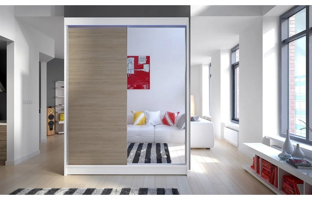 Skriňa s posuvnými dverami Belgia I, Farby: biela / sonoma + zrkadlo, Osvetlenie: bez osvetlenia