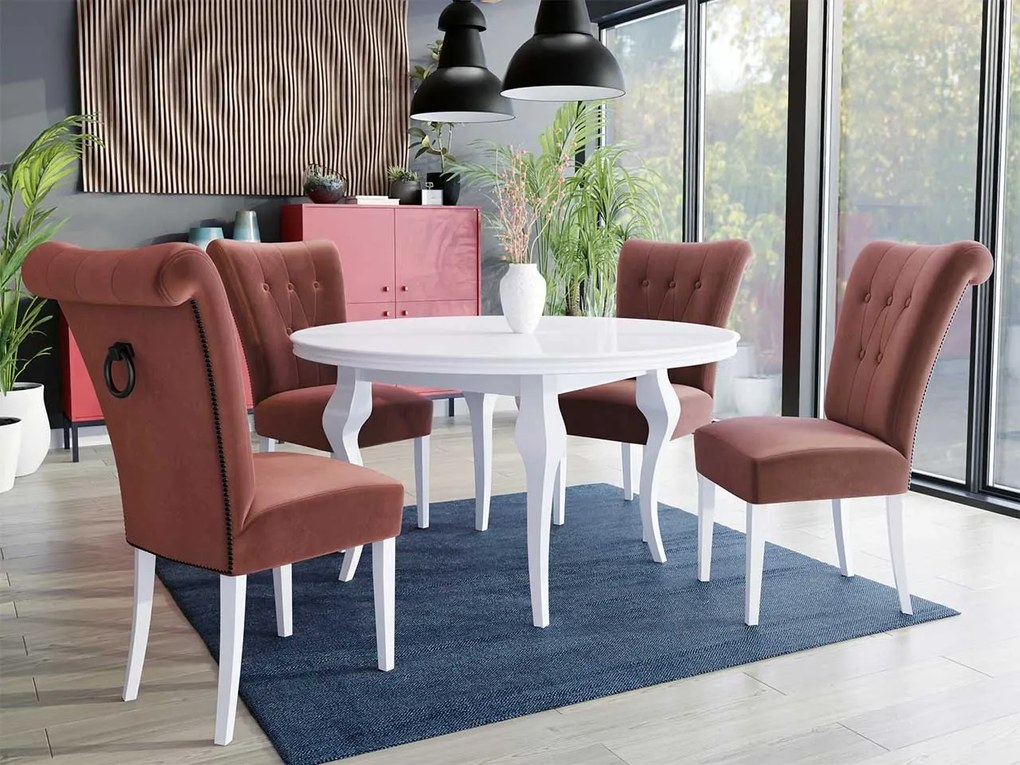 Krásne čalúnené sedačky a možnosť rozšírenia plochy pri návšteve priateľov sú prednosti stola Julia FI 100 so 4 stoličkami ST65. Perfektný do obývačky a jedálne. Galmour štýl a interiéry zariadené v modernej atmosfére si ho zamilujú.Komfort pri stolovaní s rodinou nám poskytne biely stôl, ku ktorému si môžeme vybrať stoličky v rôznych odtieňoch. Jednou z výhod tejto súpravy je jej dekoratívna vrstva. Sedadlá, ktorých operadlá sa zmenili na charakteristický valček, sú vyrobené zo zamatovej látky. Prešívanie a klopačka sú doplnkovým dekoračným prvkom.Pevné materiály zabezpečia, že stôl so stoličkami nám bude slúžiť roky. Bude centrom rodinného života a skvelou základňou pre stretnutia s priateľmi pri káve.Súprava pozostáva z:1x rozťahovací stôl Julia FI 1004x ST65 čalúnená stoličkaRozmery stola:dĺžka: 100 cm,dĺžka po rozložení: 140 cm,šírka: 100 cm,výška: 76 cmRozmery stoličky:šírka: 51 cm,výška: 100 cm,výška sedadla: 51 cm,hĺbka sedadla: 43 cm,celková hĺbka: 66 cmFarba:drevo: lesklý biely stôl, stolička - farba na výber vyššietkanina a klepadlo pre vyššie uvedené možnostimožnosť dokúpenia viacerých položiek, jednotlivých prvkov zostavy skladací okrúhly stôl Julia FI 100 a čalúnená stolička ST65Dizajn stola:vrch: 18 mm laminovaná MDF doska + PU lak,nohy: bukové drevo + PU lak,rozkladacia vložka uložená mimo stola,nohy musia byť priskrutkované k rámuVýroba stoličky:rám: bukové drevo,sedadlo: 8 mm HDF doska + 2 cm a 3 cm pena + zamatová tkanina,operadlo: prešívané s vyhrnutým vrchom (valček),5 tlačidiel na vnútornej strane,farba: vodná škvrna,ochranná vrstva: 2x vodný lakZáruka: 24 mesiacov