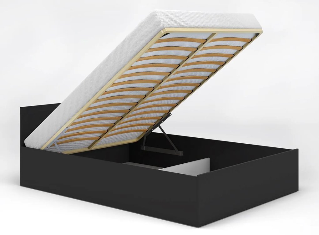 Rozmery: Šírka: 124 cm Dĺžka: 206cm Výška čela za hlavou: 80 cm Výška bočníc: 40 cm Výška čela pri nohách: 41,5cm Rozloženie: spacia plocha 120 cm x 200 cm Nosnosť: do 200kg Farby: čierna Súčasť postele: -Drevený rám s výklopným roštom na pružinách. -Kvalitný obojstranný penový matrac s prešívaným poťahom so zipsom, ktorý je prateľný. -Sada skrutiek s návodom na montáž. Krytý úložný priestor je pri nohách postele na šírku. Druh matraca Penový matrac Rozmery Šírka: 120 cm, Dĺžka: 200 cm, Výška: 8 cm ( ± 1%) Balené Balené v plaste Použitý materiál: 16mm lamino, doska odolná proti vlhkosti a oderu. MATRAC V CENE! VÝKLOPNÝ ROŠT V CENE! 1 x ÚLOŽNÝ PRIESTOR NA OBLIEČKY