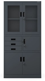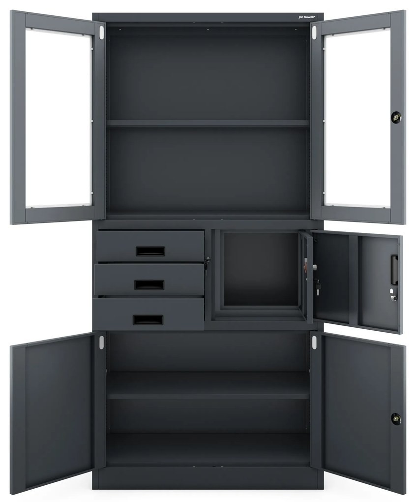 Spisová skriňa s trezorom FILIP– antracitová Kovová spisová skriňa s trezorom FILIP antracitová JAN NOWAK FILIP – kovová kancelárska skriňa s vitrínou, zásuvkami a trezorom Najbežnejšie použitie: kancelárie ordinácie, lekárne archívy, školy Spisová skriňa s vitrínou, zásuvkami a trezorom na dôležité veci– vlastnosti na 30 pákovych poradačov vitrína dvere majú spoľahlivý a kvalitný zámok (v komplete dva kľúče) trezor s bezpečnostným číselným kódom a kvalitným zámkom na kľúč (v komplete dva kľúče) 3 zásuvky majú centrálne zamykanie na spoľahlivý a kvalitný zámok (v komplete dva kľúče) odolný – solídny oceľový plech s hrúbkou 0,6 mm s povrchovou úpravou práškovou farbou tvrdené sklo nosnosťou police do 50 kg Parametre výška 185 cm šírka 90 cm hĺbka 40 cm hmotnosť 52.4 kg farba antracitová RAL 7016 Kovová spisová skriňa s vitrínou, zásuvkami a trezorom – prečo ju mať? Záruka kvality - Pevné spracovanie a najlepšie materiály. Tu je hodnota, ktorú je ťažké nájsť inde na trhu! Certifikáty – vyberajte si produkty iba s certifikátom kvality, skriňa FILIP má certifikát PZH (Štátny hygienický ústav) Súlad s GDPR 2018 – dôležité dokumenty si skladujte v skrini, ktorá spĺňa tieto požiadavky Skriňa je odosielaná v demontovanom stave, takže vyžaduje vlastnú montáž.(jednoduchý montážny návod) Kolekcia JAN NOWAK Kancelársky nábytok JAN NOWAK – kvalita a skúsenosť jedného z najväčších dodávateľov kovového nábytku v Európe.