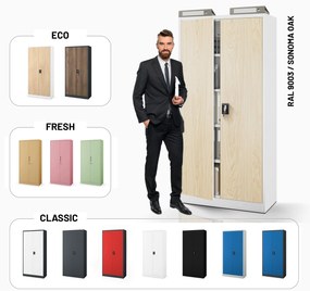 Kovová spisová skriňa KEVIN, 900 x 1400 x 400 mm, Eco Design: biela/ dub sonoma