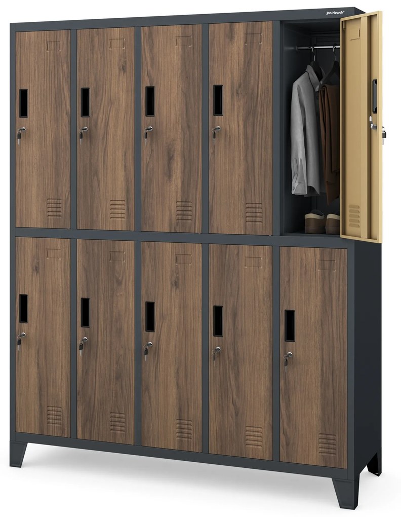 Šatňová skriňa na nôžkach BARTEK, 10 boxov – antracitová/orech Kovová šatňová skriňa s 10 boxami BARTEK antracitová/orech JAN NOWAK BARTEK – plechová šatňová skriňa s 10 boxami Najbežnejšie použitie: fabriky, šatne, fitness školy Plechová šatňová skriňa s 10 boxami – vlastnosti každý box má spoľahlivý a kvalitný zámok (v komplete dva kľúče) cirkulácia vzduchu pomocou vetracích otvorov čela boxov sú vybavené štítkom pre zasunutie opisu / mena odolný – solídny oceľový plech s hrúbkou 0,6 mm s povrchovou úpravou práškovou farbou Parametre výška 172 cm šírka 136 cm hĺbka 45 cm hmotnosť (s balením) 66 kg farba antracitová - orech (RAL 7016) Parametre boxu 4 stĺpce (počítané od ľavého okraja skrinky): Výška 77,6 cm Šírka 26,5 cm Hĺbka 45,0 cm 1 stĺpec: Výška 77,6 cm Šírka 29,0 cm Hĺbka 45,0 cm Plechová šatňová skriňa s boxami – prečo ju mať? Záruka kvality - Najlepšie materiály a žiadne kompromisy v spracovaní. Certifikáty – vyberajte si produkty iba so certifikátom kvality, skriňa BARTEK má certifikát PZH (Štátny hygienický ústav) Súlad s GDPR 2018 – dôležité dokumenty si skladujte v skrini, ktorá spĺňa tieto požiadavky Skriňa je odosielaná v demontovanom stave, takže vyžaduje vlastnú montáž.(jednoduchý montážny návod) Kolekcia JAN NOWAK Kancelársky nábytok JAN NOWAK – kvalita a skúsenosť jedného z najväčších dodávateľov kovového nábytku v Európe.