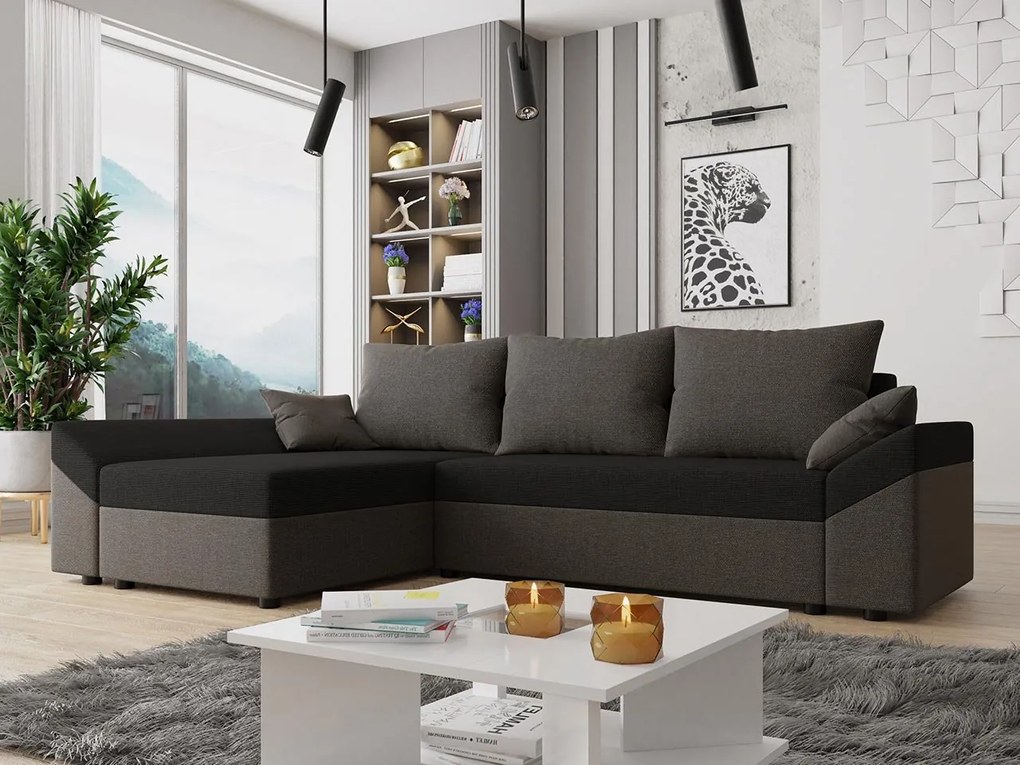 Rozkladacia rohová čalúnená sedacia súprava s úložným priestorom do tvaru L AVESTA pravá sivá