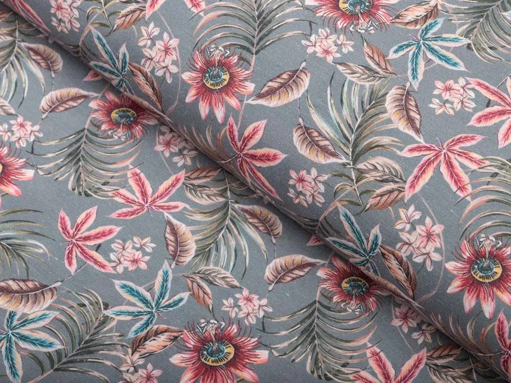 Dekoračná obliečka na vankúš so vzorom tropických kvetov na sivom podklade. Je ušitá z kvalitnej a pevnej dekoračnej látky s digitálnou tlačou, v zložení 40% bavlny a 60% polyesteru. Zapínanie na zips je skryté na spodnej strane obliečky a neruší tak jej celkový vzhľad. K obliečkam na vankúše ponúkame aj výplňové vankúše. Šijeme v našich krajčírskych dielňach v ČR, ponúkame aj rozmery na mieru.