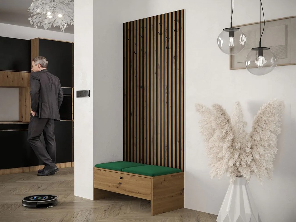 Esmoltis IV sa postará o štýlový dizajn predsiene. Kombinácia skrinky na topánky so sedadlom a panelu s vešiakmi zvyšuje funkčnosť celej miestnosti. Upravuje vstup do bytu a podporuje harmóniu a módny vzhľad.Panel zdobený lamelami poskytuje priestor na zavesenie kabátov a búnd. Háčiky, ktoré sú k nemu pripevnené, ladia so štýlom vďaka svojej tmavej farbe. Nenápadne organizujú skladovanie vrchného oblečenia.Rozmery:Lamelová stena Esmoltis:šírka: 85 cm, výška: 206 cm, hĺbka: 44 cm,Čalúnený panel PAG 42x42: x2šírka: 42 cm, výška: 42 cm, hĺbka: 4 cmPrevedenie pevného nábytku:predná časť a telo: 16 mm hrubá laminovaná doska,hrany sú zakončené odolnou PVC dyhou odolnou voči poškodeniu,zadná časť nábytku z HDF dosky,kovové rukoväte,vešiaky obsahujú 6 plastových dvojitých háčikov,prvky spojené pomocou excentrických spojok,dekoratívna lišta z dubového dreva artisan z plastu na samolepenieČalúnené panely:materiál: podklad panelu tvorí 8 mm hrubá doska + 3 cm hrubá pena T18 + tkanina,tvar: štvorcový,3D efekt,chráni steny pred poškodením,zvukotesnosť,použitie: pre interiér,panely ideálne na povrchovú úpravu stienZáruka: 24 mesiacov