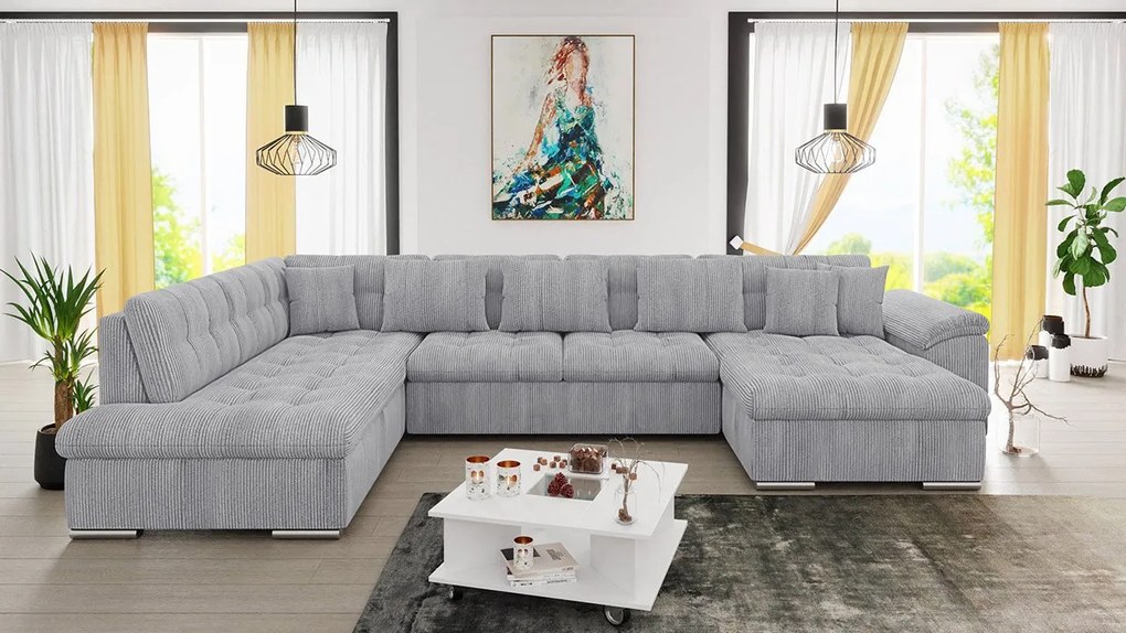 Vo svojom byte máte značný priestor, takže veľká rohová sedačka do obývačky Tony je pre vás to pravé. Ponúka veľký priestor na spanie aj pohodlný odpočinok počas dňa. Je vyrobený z výnimočnej látky, ktorá obohatí váš priestor a urobí ho skutočne jedinečným.Rohová sedacia súprava sa vyznačuje solídnym spracovaním. Kombinácia krásneho dizajnu a funkčnosti. Je to rozkladací model vybavený vankúšmi na zips. Voľne stojaci variant ponúka široké možnosti usporiadania. Jeho tvar pripomína písmeno "U". Vďaka bohatej farebnej škále sa hodí takmer ku každému štýlu.Rozmery:šírka: 348 cm,hĺbka: 205 cm,výška: 76 cm,povrch na spanie: 290 x 125 cmRohová strana: ľavá alebo praváPrevedenie:drevený rám + drevotrieska,vysoko elastická penavlnitá pružina,rozkladacia rohová pohovka,funkcia spánku,bez nádoby na podstielku,vankúše sú súčasťou balenia,vankúše na zips,voľne stojaca rohová pohovka (zadná časť čalúnená látkou)Záruka: 24 mesiacov