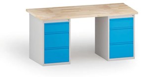 Dielenský pracovný stôl GD, buková škárovka, pevná noha + zásuvkový dielenský box na náradie, 5 zásuviek, 1700 x 800 x 850 mm, modrá
