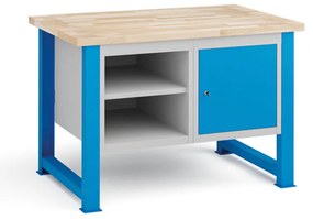 Pracovná doska stolov je vyrobená z masívnej škárovky z tvrdého dreva s hrúbkou 40 mm. Vyššia váha dosky spolu s pevným a stabilným podnožím zaručuje veľmi dobrú stabilitu stola, ktorá vyhovuje aj tým najnáročnejším druhom práce. Nohy stolov sú zvarené z oceľových profilov hrúbky 3 mm a lakované práškovaným lakom RAL 5012. Stoly sú vyrábané v troch dĺžkach: 1200, 1700 a 2100 mm. Kontajnery uložené na spojovacej pozdĺžnej traverzie alebo v hornej časti priamo skrutkované na spodnú časť pracovnej dosky. Kontajnery sú vyrobené z oceľového plechu, zásuvky s nosnosťou 40 kg sú usadené v kvalitných pojazdoch na guličkových ložiskách s až 100% výsuvom. Zásuvky sú uzamykateľné centrálnym cylindrickým zámkom s dvoma kľúčmi. Povrchová úprava práškovaným lakom - rám sivej farby RAL 7035, zásuvky modrej farby v odtieni RAL 5012.