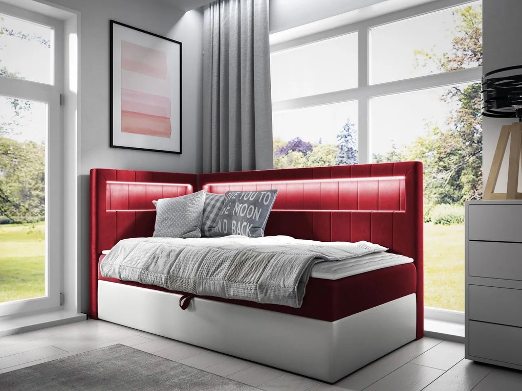 Moderná kontinentálna posteľ pre jednu osobu Junior Ribezo 3 zaisťuje pohodlný odpočinok. Výber niekoľkých šírok umožňuje prispôsobiť si nábytok vášmu pohodliu.Ozdobným prvkom postele je čalúnené čelo a bočnica. Posteľ má aj LED osvetlenie. Okrem pekného vzhľadu plní ešte jednu dôležitú úlohu – chráni steny pred odreninami a nečistotami.Jednolôžková kontinentálna posteľ Ribezo 3 je vybavená aj úložným priestorom. Umožňuje diskrétne uložiť na noc vankúš, prikrývku alebo deku.Dostupné rozmery:80:hĺbka: 212 cm, šírka: 92 cm, výška: 115 cm,plocha na spanie: 80 x 200 cm,rozmery úložného boxu: hĺbka: 197 cm, šírka: 77 cm, výška 25 cm,90:hĺbka: 212 cm, šírka: 102 cm, výška: 115 cm,spacia plocha: 90 x 200 cm,rozmery úložného boxu: hĺbka: 197 cm, šírka: 87 cm, výška 25 cm100:hĺbka: 212 cm, šírka: 112 cm, výška: 115 cm,plocha na spanie: 100 x 200 cm,rozmery úložného boxu: hĺbka: 197 cm, šírka: 97 cm, výška 25 cmPrevedenie:konštrukcia: 16 mm laminovaná doska + 6 cm hrubé drevo,operadlo: 16 mm hrubá doska + T25 vysokoelastická pena,má úložný priestor - zdvíhanie vďaka pružinám, vďaka čomu je obsluha veľmi jednoduchá a ľahká,hlavný matrac: bonellové pružiny + T25 vysokoelastická pena,stupeň tvrdosti hlavného matraca (stredná vrstva lôžka): T3 - stredne tvrdý,v hornej časti - horný matrac (Mandula topper):stredne tvrdý,hrúbka cca 2,5 cm,prešívaný poťah,topper vyrobený z najkvalitnejších hypoalergénnych materiálov:antibakteriálna a protiplesňová polyesterová tkanina 200 g.,20 mm PU pena: vyznačuje sa vysokým stupňom hustoty, primeranou tvrdosťou a elasticitou, nízkou náchylnosťou na deformáciu, vysokým komfortom používania,netkaná textília s vysokou vzdušnosťou 100 g vyrobená z polyesterového vlákna,fleece 35 g z kvalitnej netkanej textílie,polyesterové mikrovlákno 82 g: priedušné, vysoká absorpcia vlhkosti, antialergické, bariéra proti prachu a roztočom,topper má 4 odolné upevňovacie gumy, ktoré zabraňujú pohybu matraca,lem: olemovaný páskou po obvode,obojstranné - obe strany sú využiteľný priestor,matrac sa odporúča otočiť každé 2-3 mesiace,prateľný na 30˚Cplastové nohy,posteľ nie je voľne stojaca,osvetlenie čela v cene postelevýber strany postele určuje, z ktorej strany sa otvára úložný priestorZáruka: 24 mesiacov